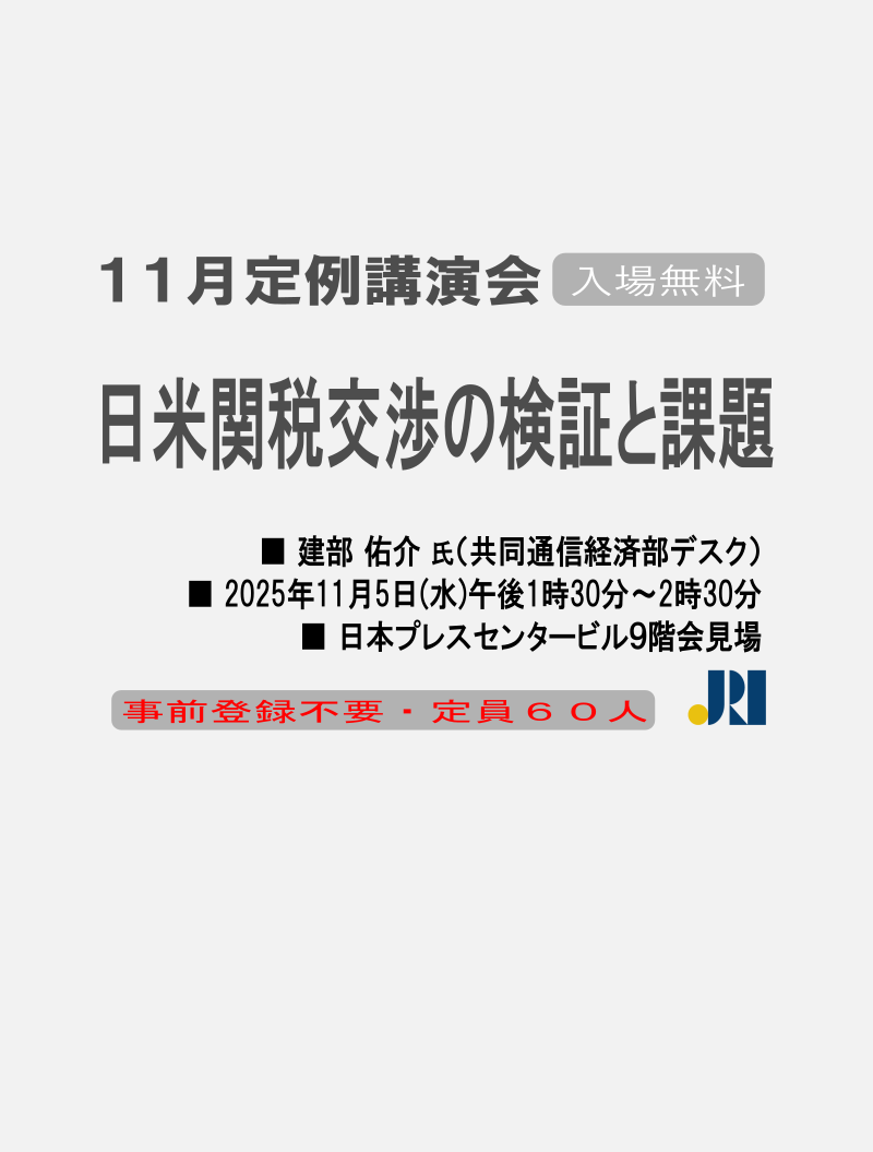 - 「日米関税交渉の検証と課題」 共同通信経済部デスクが講演(事前申し込み不要、定員60人)