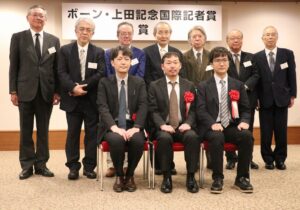 新聞通信調査会のボーン・上田記念国際記者賞委員会は19日、東京・内幸町のプレスセンタービルで2025年度の授賞式を開き、同賞の共同通信政治部、福田公則(ふくだ・まさのり)記者と毎日新聞カイロ支局長、金子淳(かねこ・じゅん)記者の2人、特別賞の日本テレビ国際部(フェイドイン所属)、坂井英人(さかい・ひでと)記者に、それぞれ賞状を授与するとともに記念品のブロンズ製ブックエンドと万年筆を贈りました。