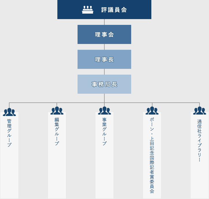 評議員会 理事会 理事長 事務局長 管理グループ 編集グループ 事業グループ ボーン・上田記念国際記者賞委員会 通信社ライブラリー 評議員会 理事会 理事長 事務局長 管理グループ 編集グループ 事業グループ ボーン・上田記念国際記者賞委員会 通信社ライブラリー