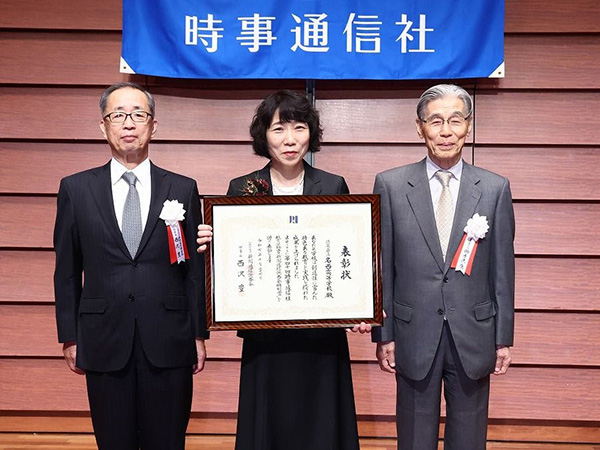 徳島県立名西高等学校の大久保民枝校長(中央)、新聞通信調査会の西沢豊理事長(左)と、審査委員長の御手洗康放送大学教育振興会理事長(右)(2025年10月27日、時事通信ホール)