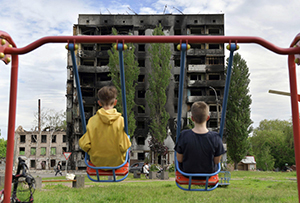 1946(昭和21)年8月、前年の8月に長崎に投下された原子爆弾で倒壊したカトリック教会「浦上天主堂」跡で祈りをささげる信徒たち。浦上地区には多くのカトリック信徒が暮らし、同地区の信徒約1万2千人のうち、8千人以上が45年末までに犠牲になったとされる。